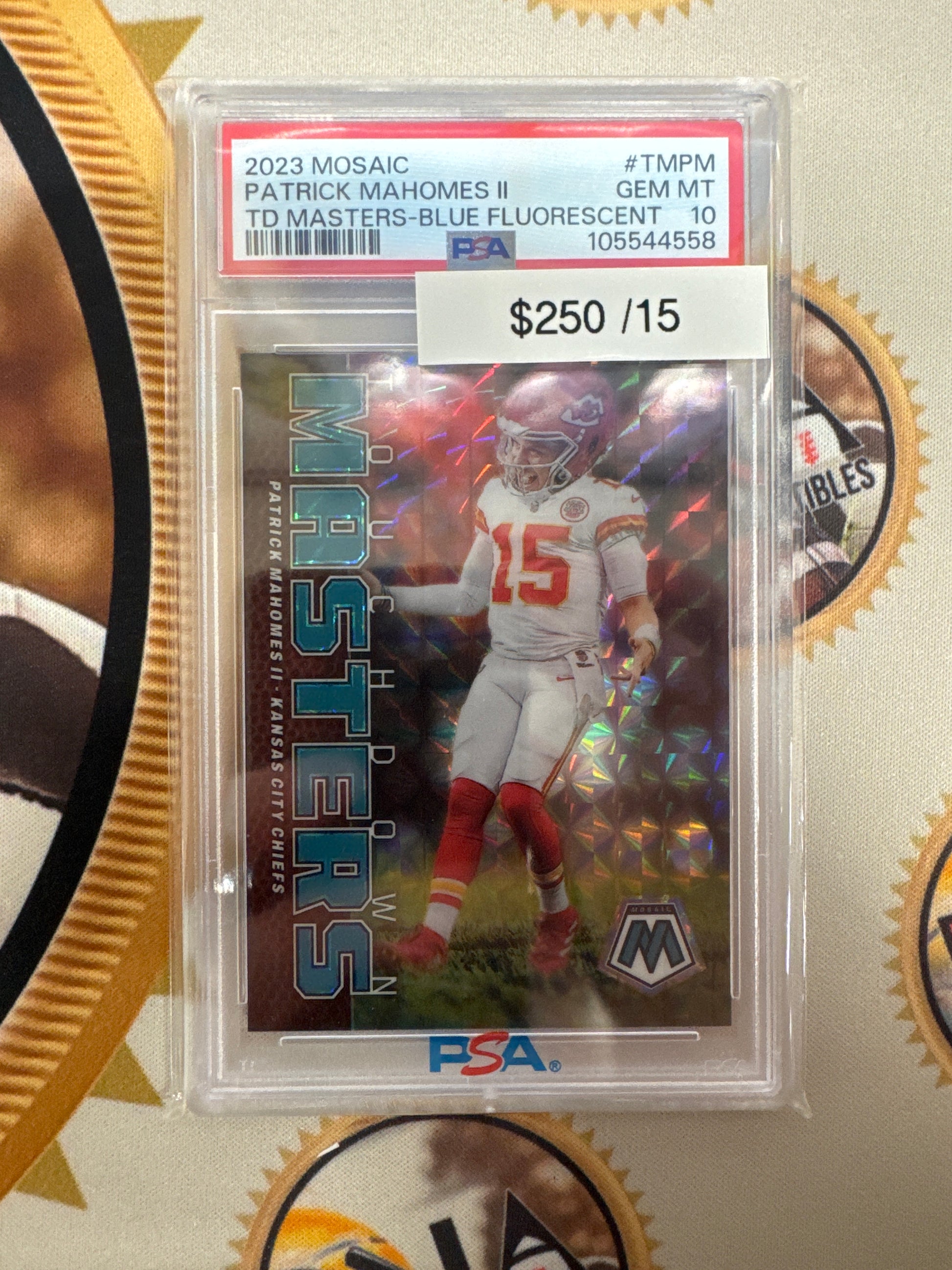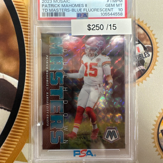 2023 Panini Mosaic NFL Patrick Mahomes II Touchdown Masters Blue Fluorescent /15 PSA 10
